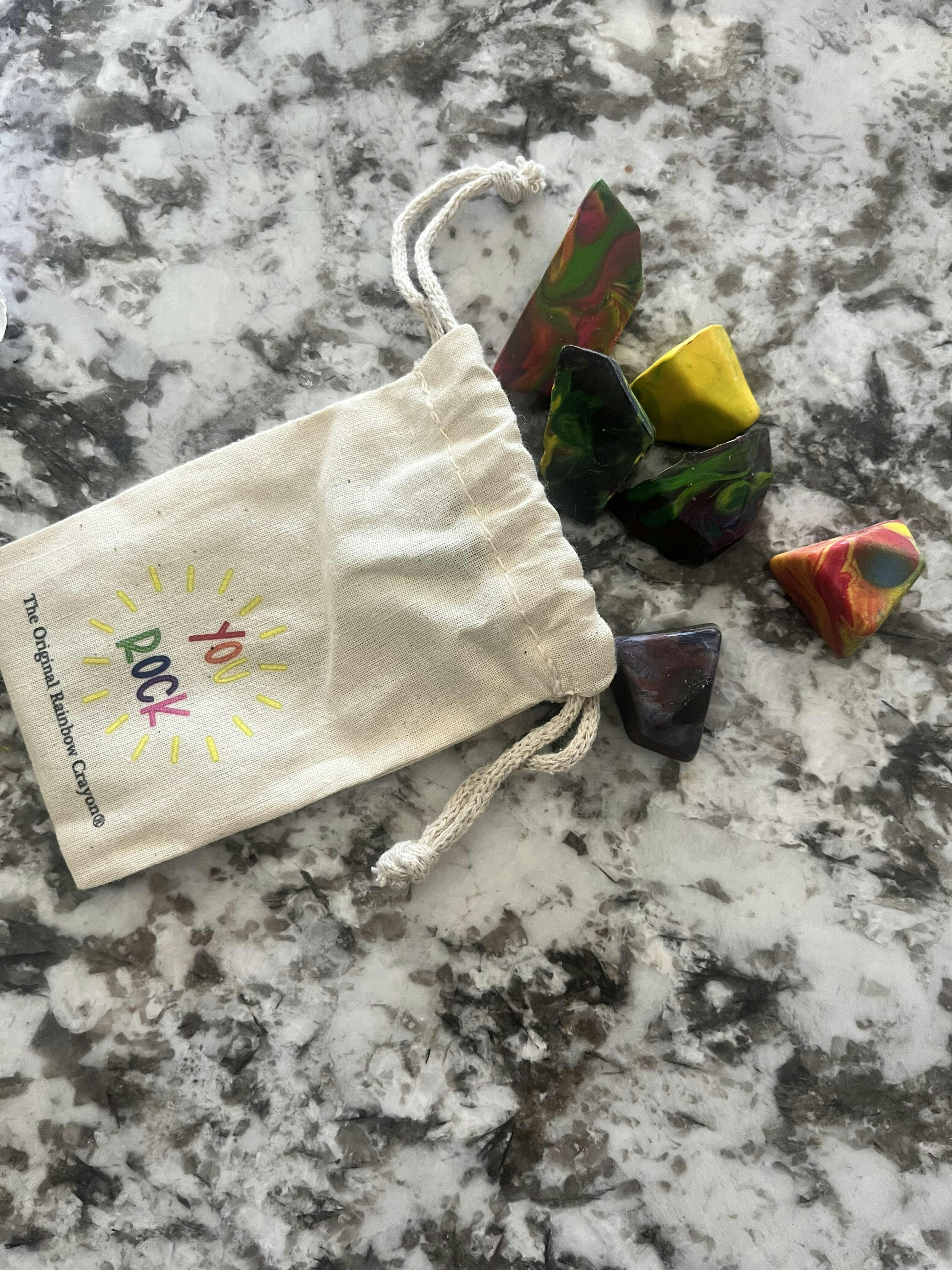 -7 Rainbow Rock Crayons placed inside the cotton, mini drawstring bag for gifting